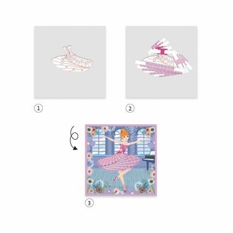 Atelier creativ cu hartie plisata Dansatoare Un kit de pliere și lipire pentru decorarea cu benzi de hârtie a 4 modele ilustrate, într-o gamă largă de modele și texturi. Copiii urmează designul oferit pentru a plia și lipi fâșiile de hârtie una peste alta pentru a crea costume pentru 4 dansatoare grațioase. O activitate de pliere și lipire care adaugă lumină, umbră și volum imaginilor. Conținut: 4 planșe ilustrate (20 x 20 cm), 4 coli șablon, 4 fundaluri, benzi de hârtie tipărite și texturate asortate, autocolante din hârtie, 20 autocolante din spumă față-verso, broșură color cu instrucțiuni pas cu pas. Conține 4 planșe predesenate și decupate (200 x 200 mm), 4 șabloane, 3 coli cu segmente individualizate (hașurate) autoadevize, 56 de benzi de hârtie decorativă (ilustrate, texturi diferite), o carticică cu instrucțiuni. Vârsta recomandată: 7 -12 ani. Confecționat din hârtie și materiale non toxice. Conform reglementărilor EN71&ASTM. Avertisment: Contraindicat copiilor sub 3 ani. A se utiliza sub stricta supraveghere a unei persoane adulte. Producător: Djeco, Franța