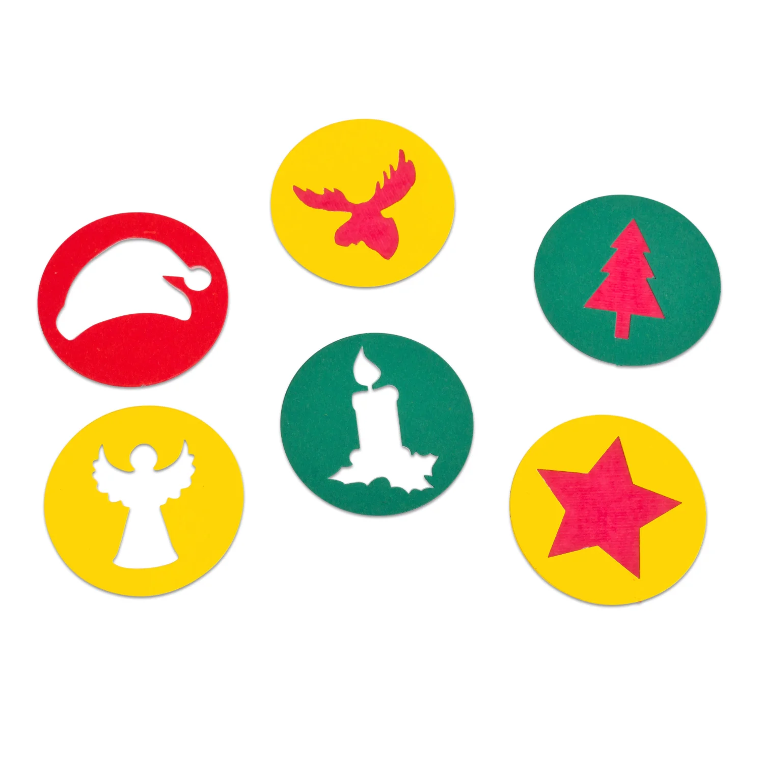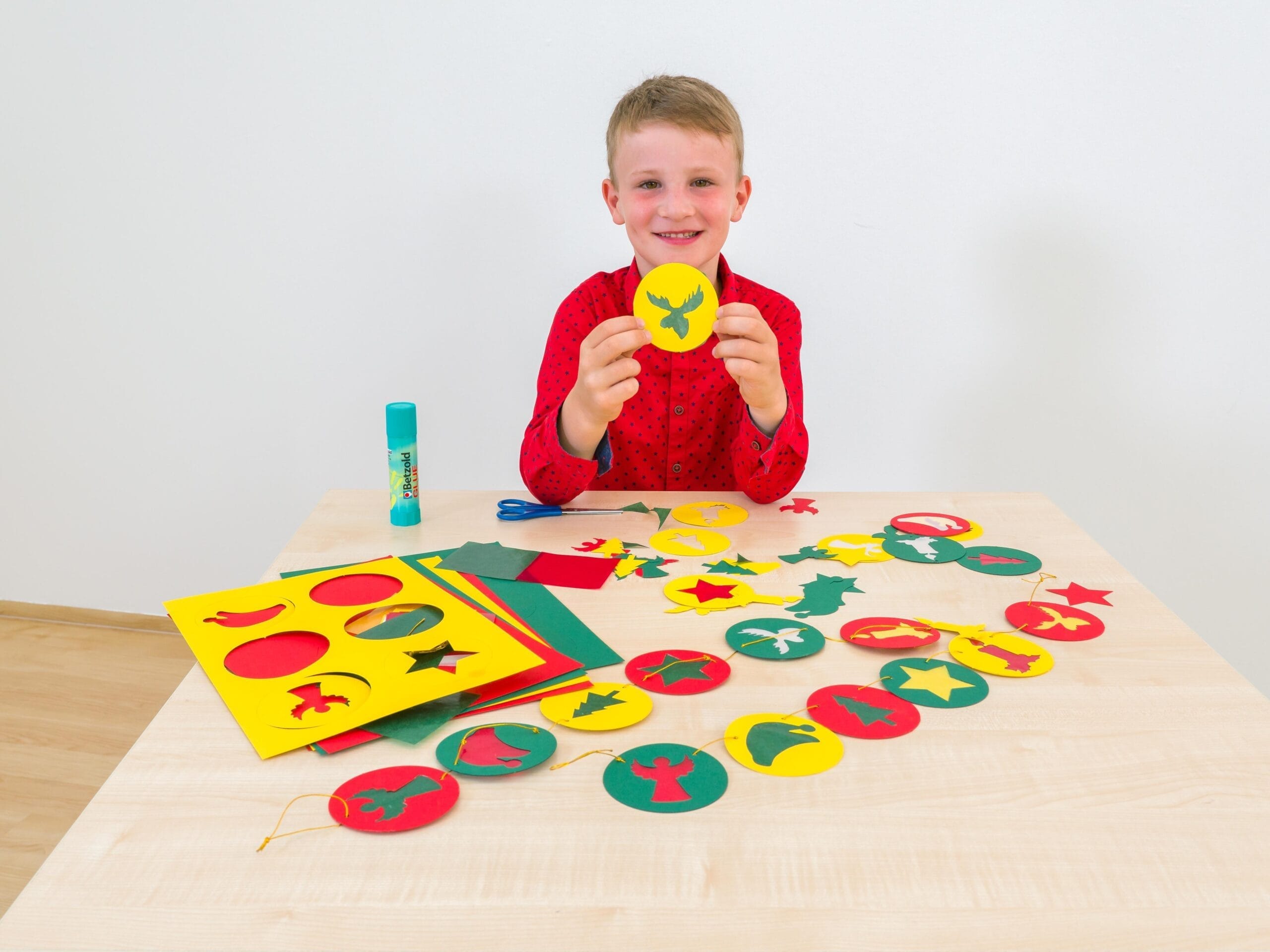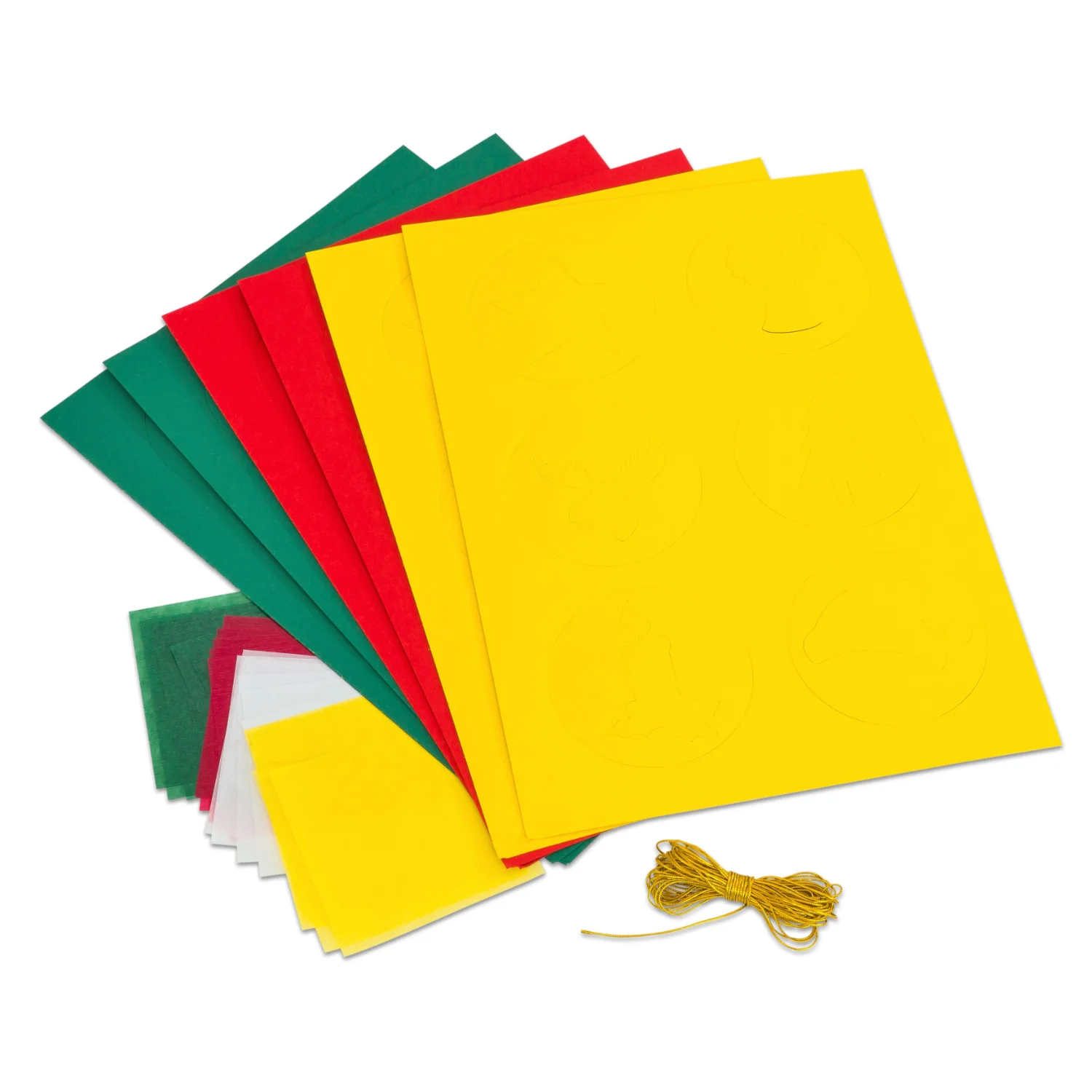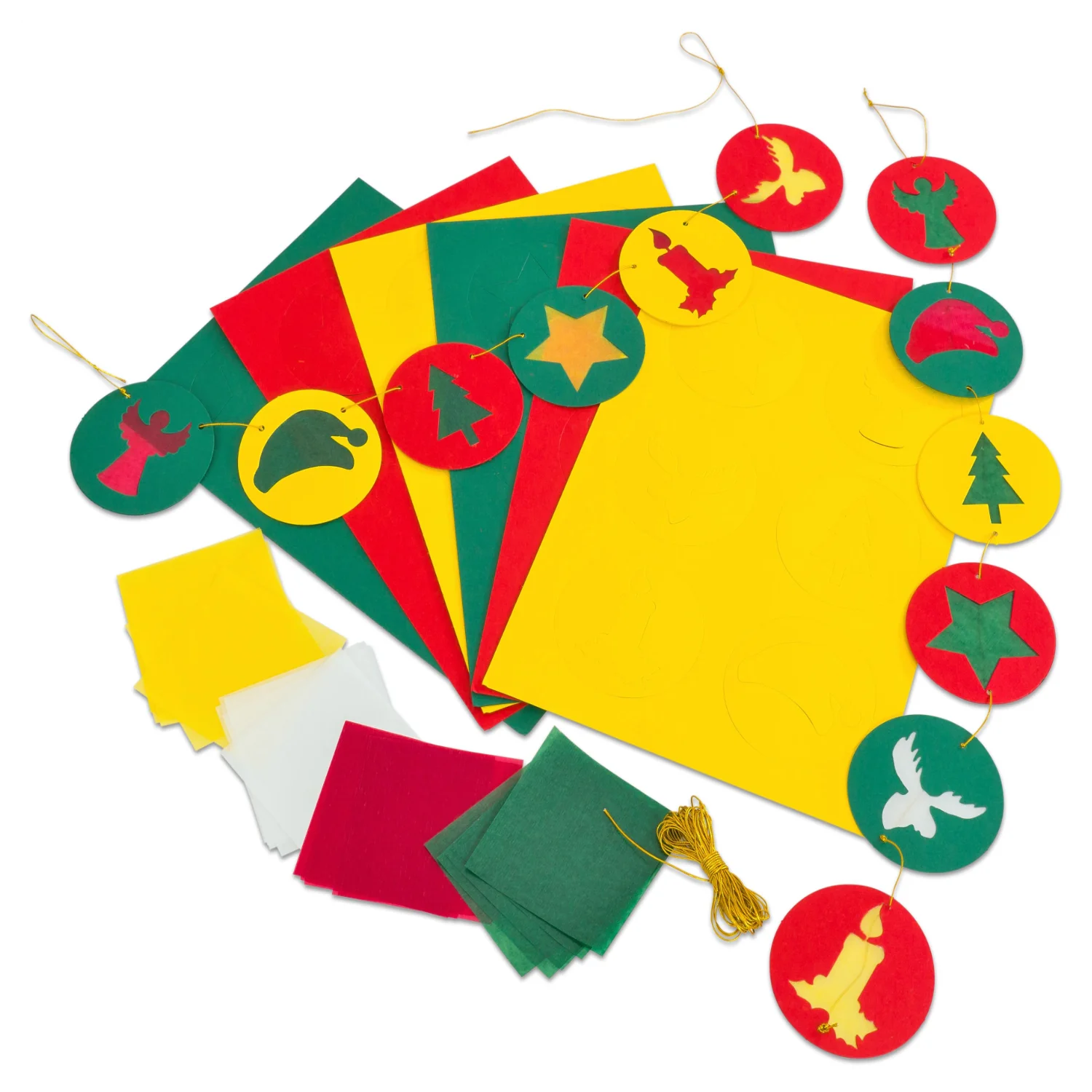 Un kit de bricolaj fără pregătire complicată. Deschide şi bricolează! Fără prea mult efort, se pot realiza 6 ghirlande mari din discuri colorate cu diametrul de 8 cm, cu motive preştanţate. Pur și simplu lipiți hârtia transparentă în spatele cercurilor, decupați-le de jur împrejur și înșirați-le orizontal sau vertical cu ajutorul cordonului auriu.