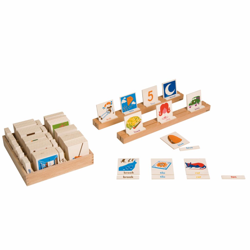 A material, ideal for reading practice, containing 100 wooden cards with colorful illustrations of simple objects with labels to read and match. The material is designed to be self-correcting, allowing for independent work. A beechwood tray and 2 stands are included.