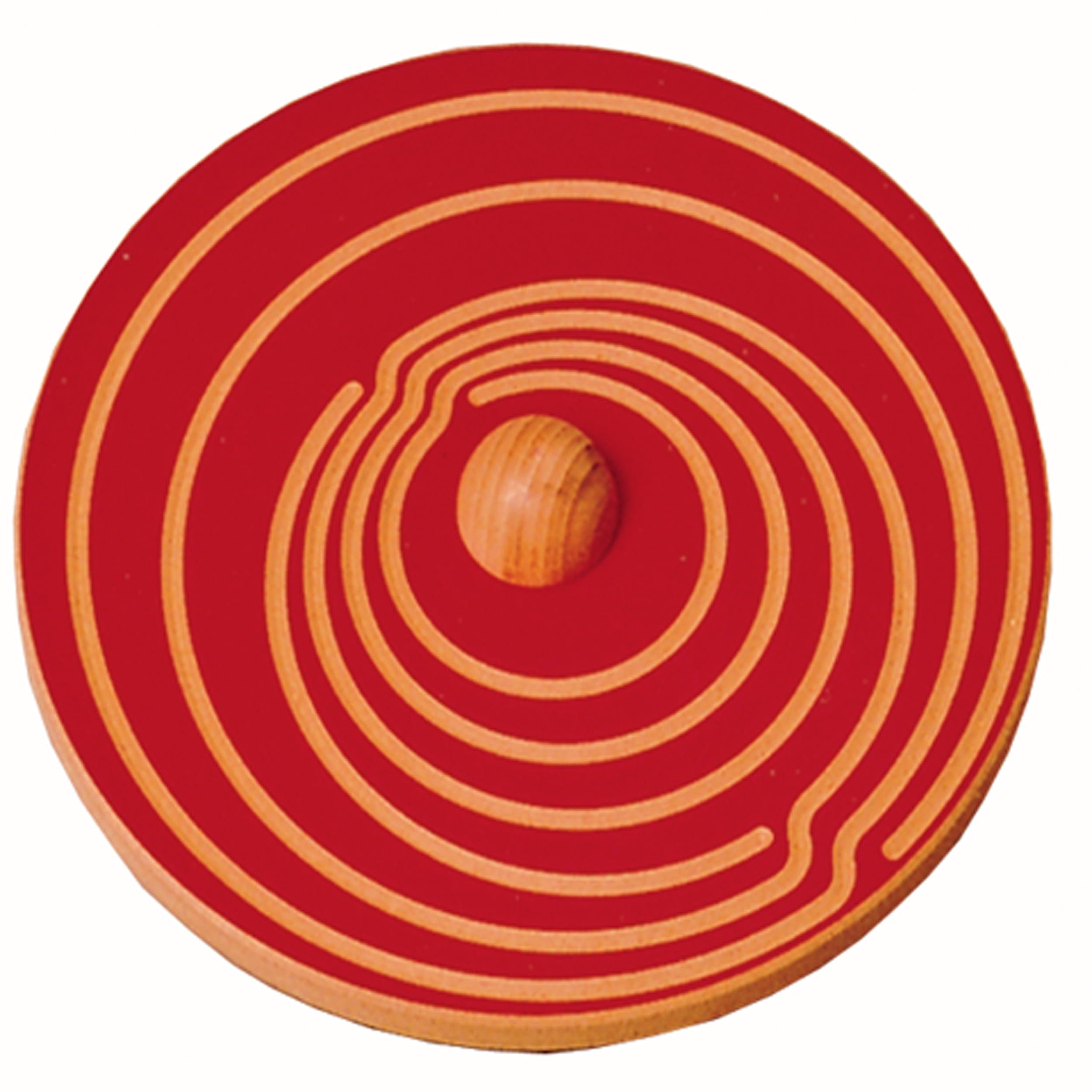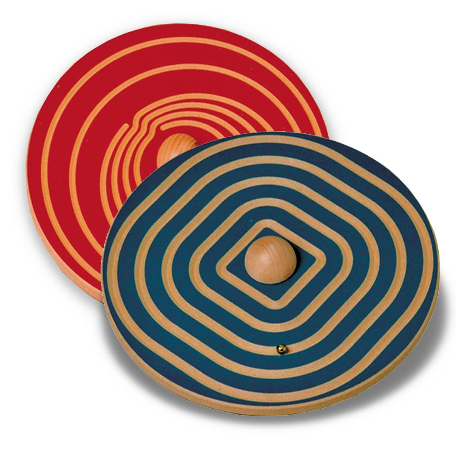 – Două labirinturi din lemn, Ø 25 cm, o parte albastră, o parte roșie, cu 4 modele diferite, fiecare cu o semisferă groasă din de culoare naturală, în mijloc.