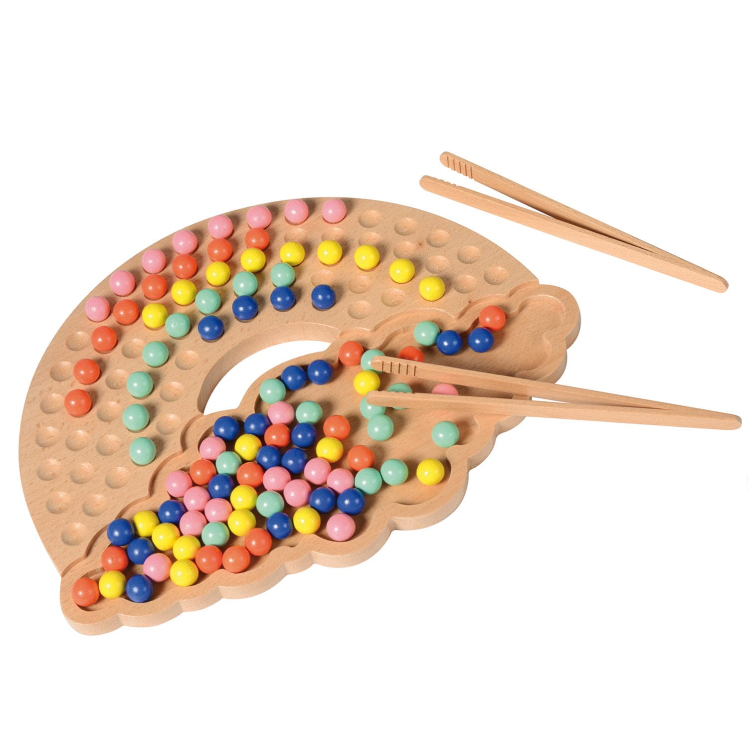 Platoul cu mărgele / bile oferă o activitate liniștită pentru dezvoltarea abilităților motorii fine. Unul sau doi copii pot umple tabla de joc în formă de semicerc cu bilele colorate din lemn într-o ordine prestabilită sau pot crea modele colorate după preferinţele lor.
