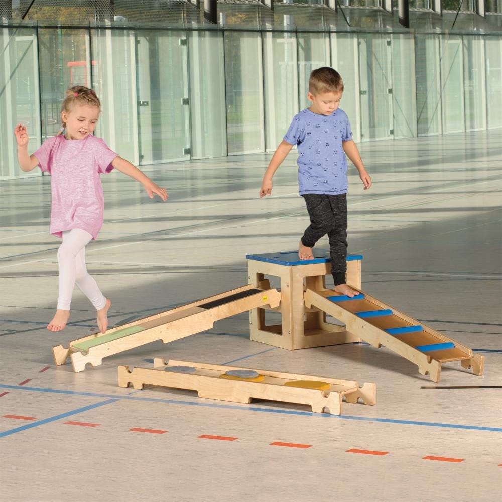 Configuraţie completă de trasee senzoriale: include 3 poteci tactile şi de echilibru + 1 lădiţă gimnastică pătrată (SportBox S). Totul din lemn durabil, trasee tip S, de 115 cm lungime, cu segmente pentru experienţe tactile deosebite pentru copii. Lădiţa de gimnastică poate fi folosită ca modul de ancorare pentru diferitele trasee sau individual ca scăunel, obstacol sau integrată în alte configuraţii pentru educaţie fizică / gimnastică.