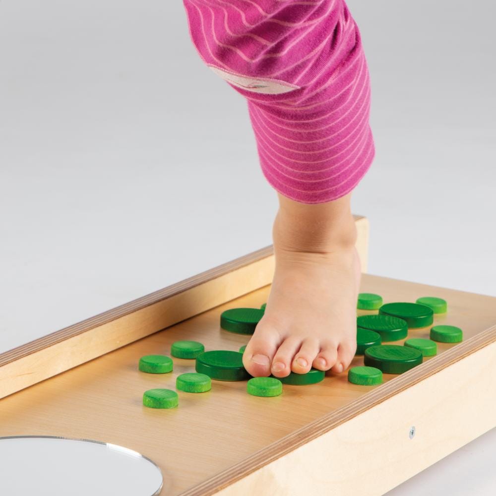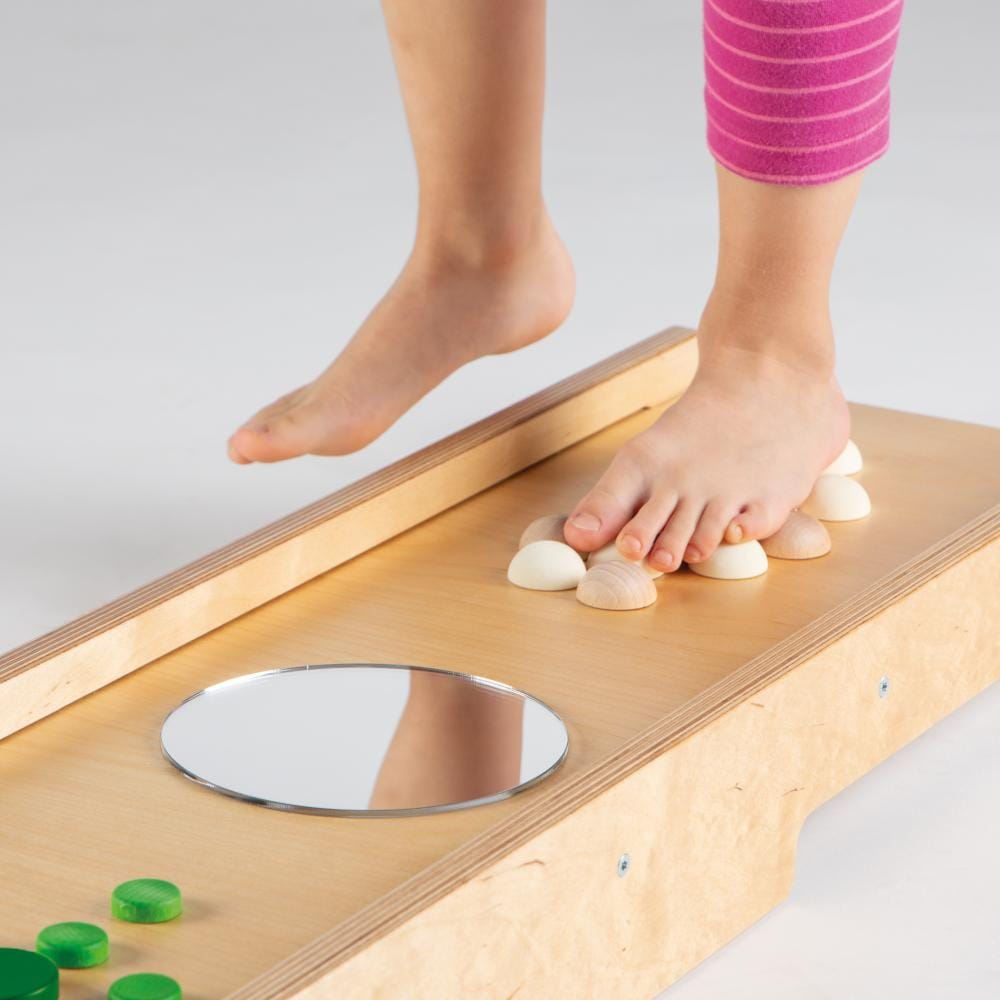 Placă şi traseu senzorial din lemn durabil, 190 cm lungime, cu monturi pentru experienţe tactile deosebite pentru copii: 3 zone de „pietricele” şi o zonă „oglindă”. Placa are o lăţime de 24 cm şi este confecţionată integral din lemn multiplu stratificat cu rezistenţă mare în mediu de utilizare dinamic.