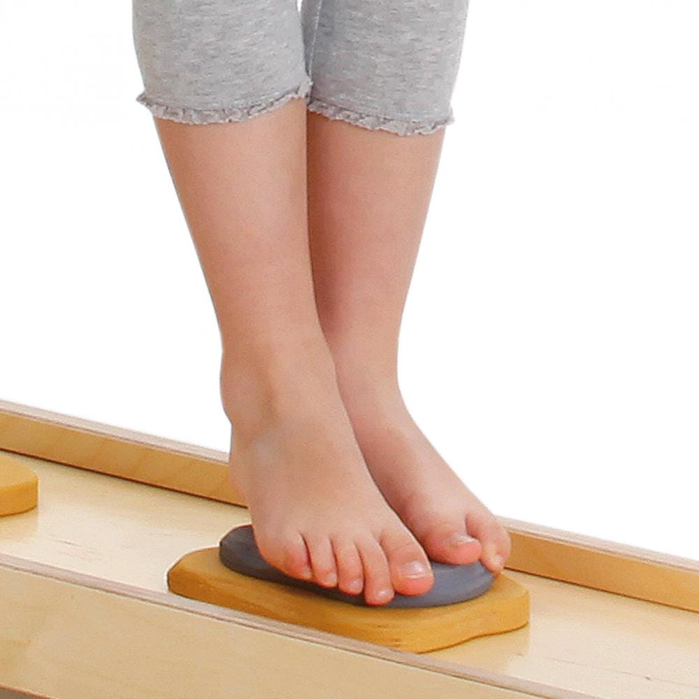 Placă şi traseu senzorial din lemn durabil, 190 cm lungime, cu segmente pentru experienţe tactile deosebite pentru copii: Roci mari, cu margini neregulate, înălţimi diferite. Vor încuraja copiii la mersul alternat stânga-dreapta şi ajută la dezvoltarea musculaturii şi la coordonarea mişcărilor picioarelor.