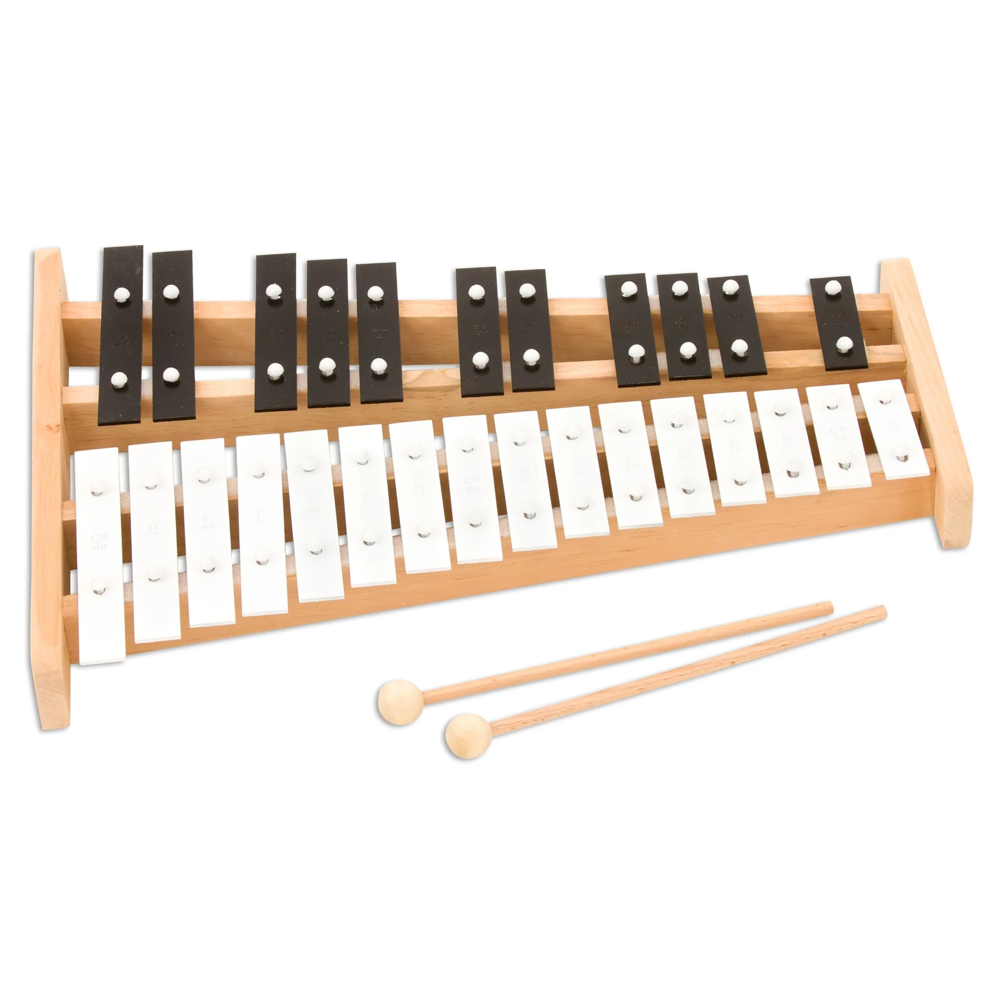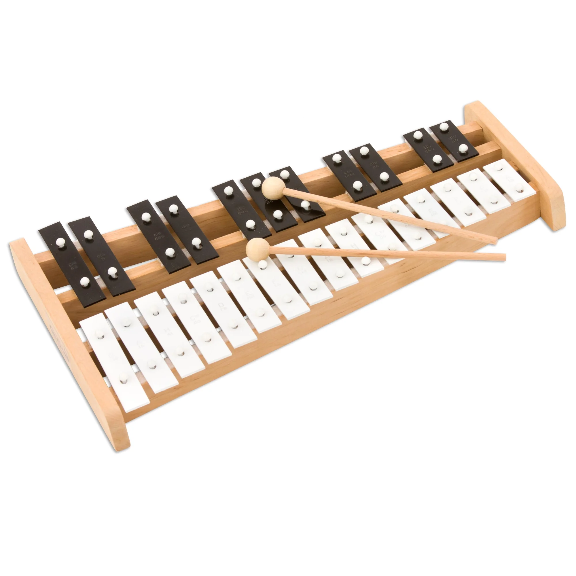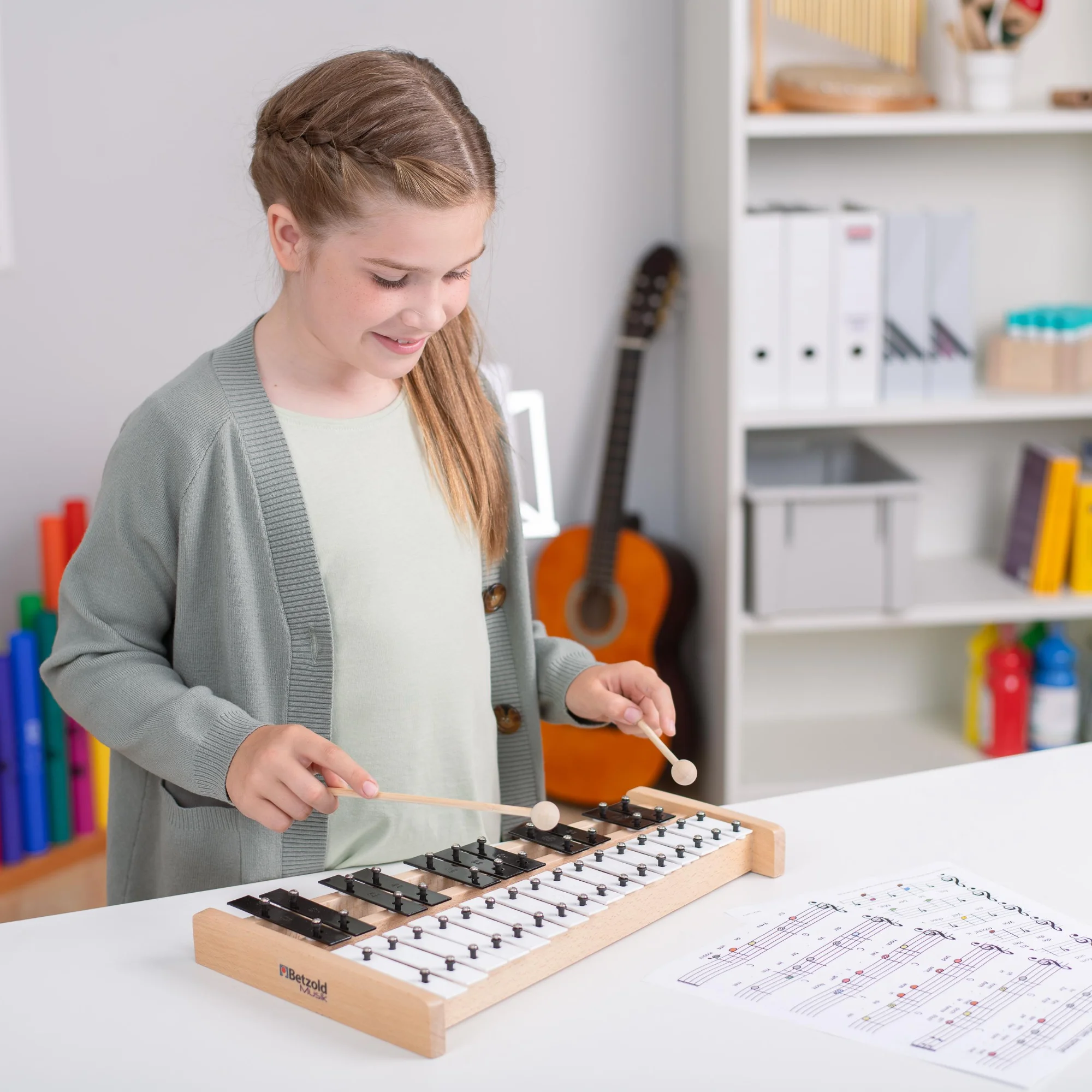 Acest Glockenspiel cromatic este echipat cu 27 de lamele sonore metalice și este modelat după claviatura unui pian. Acoperă 2 octave complete cu toate tonurile şi semitonurile. Este acompaniamentul perfect pentru toate cântecele cunoscute pentru copii şi pentru educaţia muzicală timpurie.