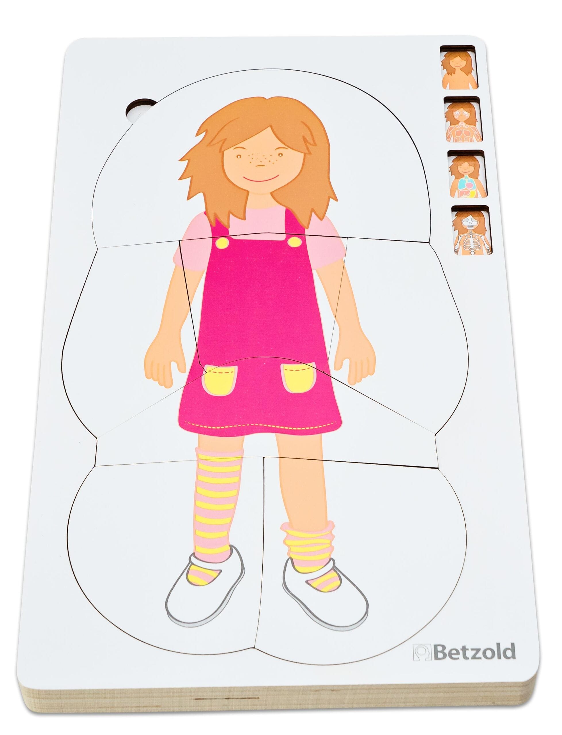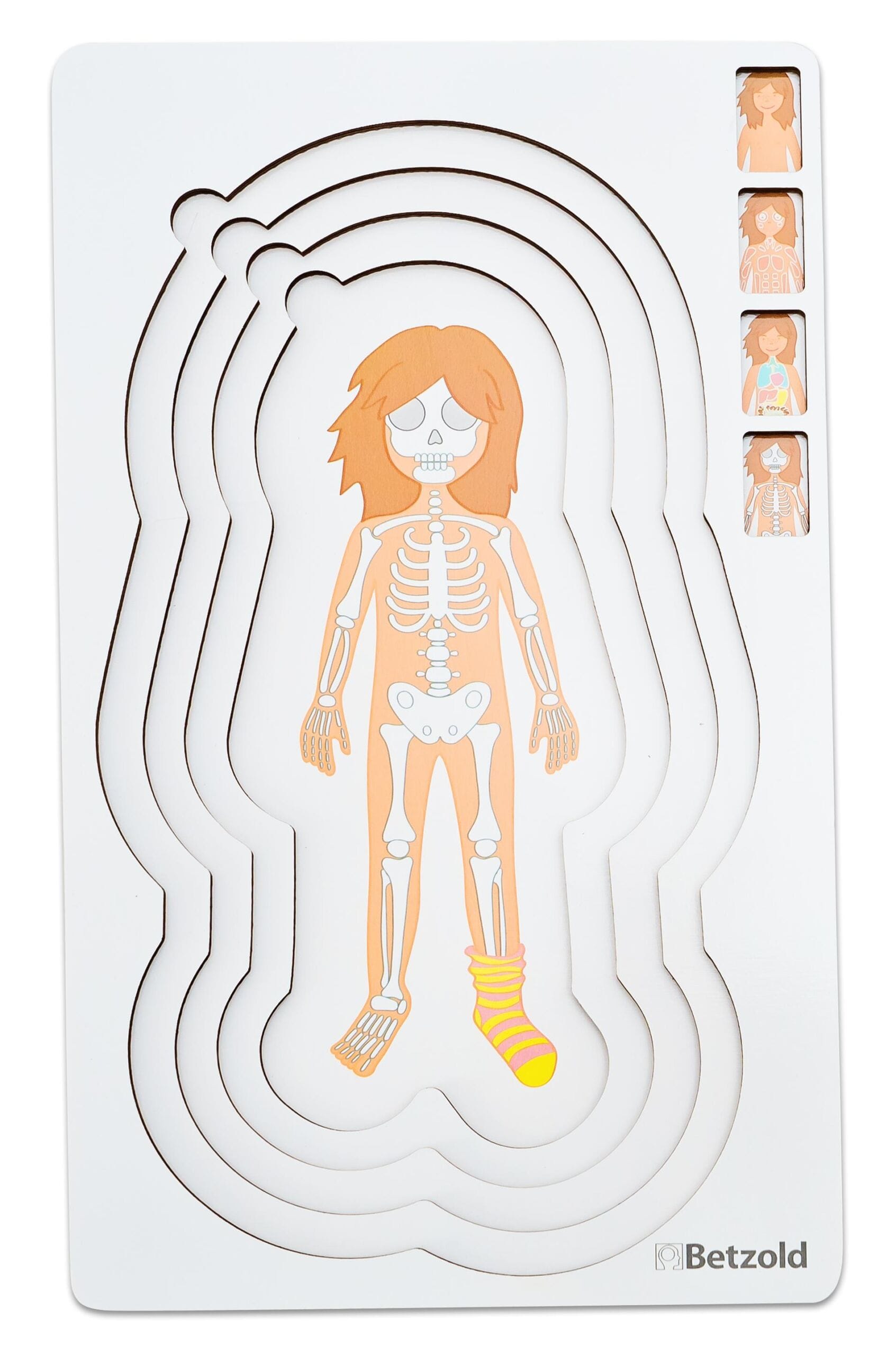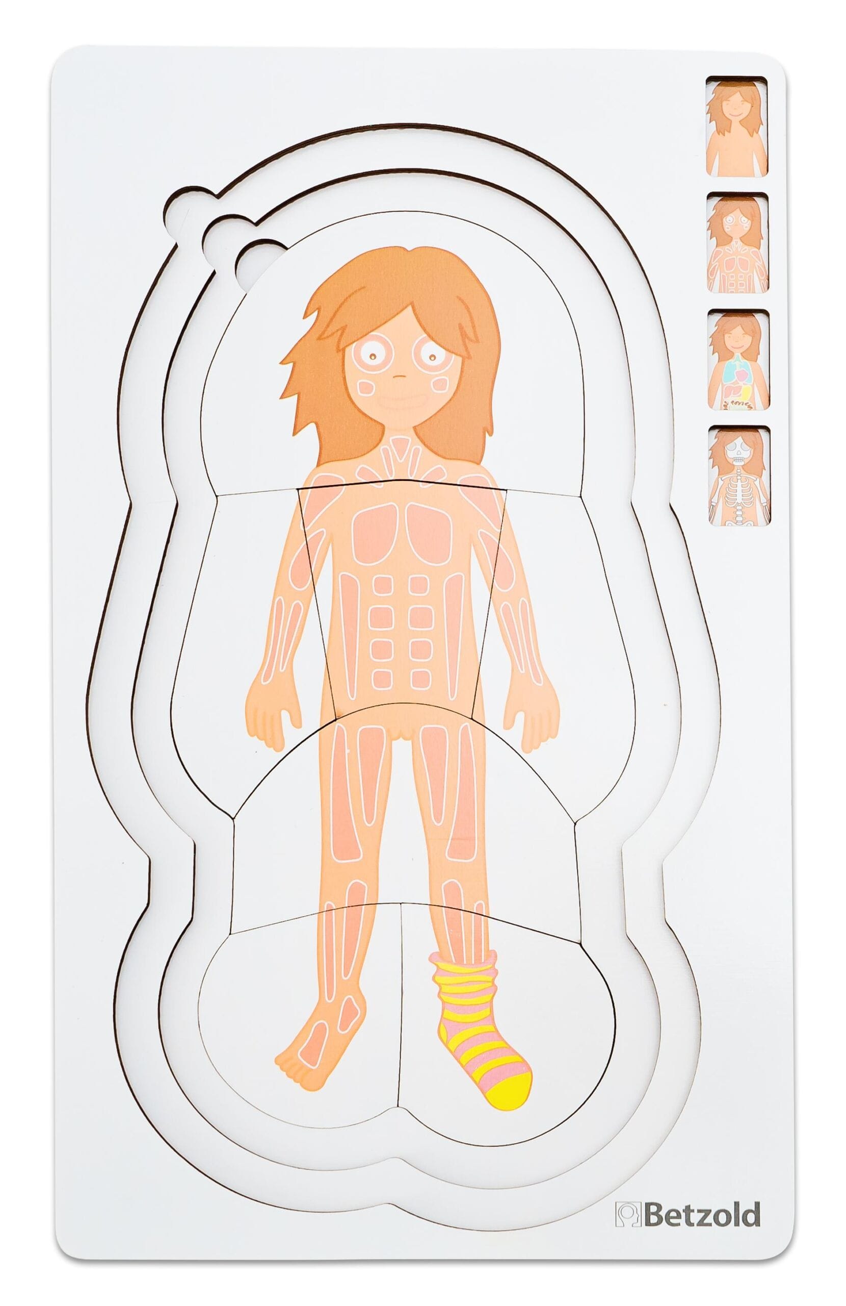 Acest puzzle cu 28 de piese în 4 straturi arată interiorul corpului uman. Copiii vor putea identifica organele, scheletul şi musculatura. Straturile individuale sunt marcate pe lateral cu o secțiune a imaginii pentru orientare. Fiecare strat este format din 7 piese. Acestea pot fi completate ca la un puzzle orizontal, sau pot fi descoperite vertical, în adâncime sau pot fi „jucate” separat, una lângă alta pe o masă.