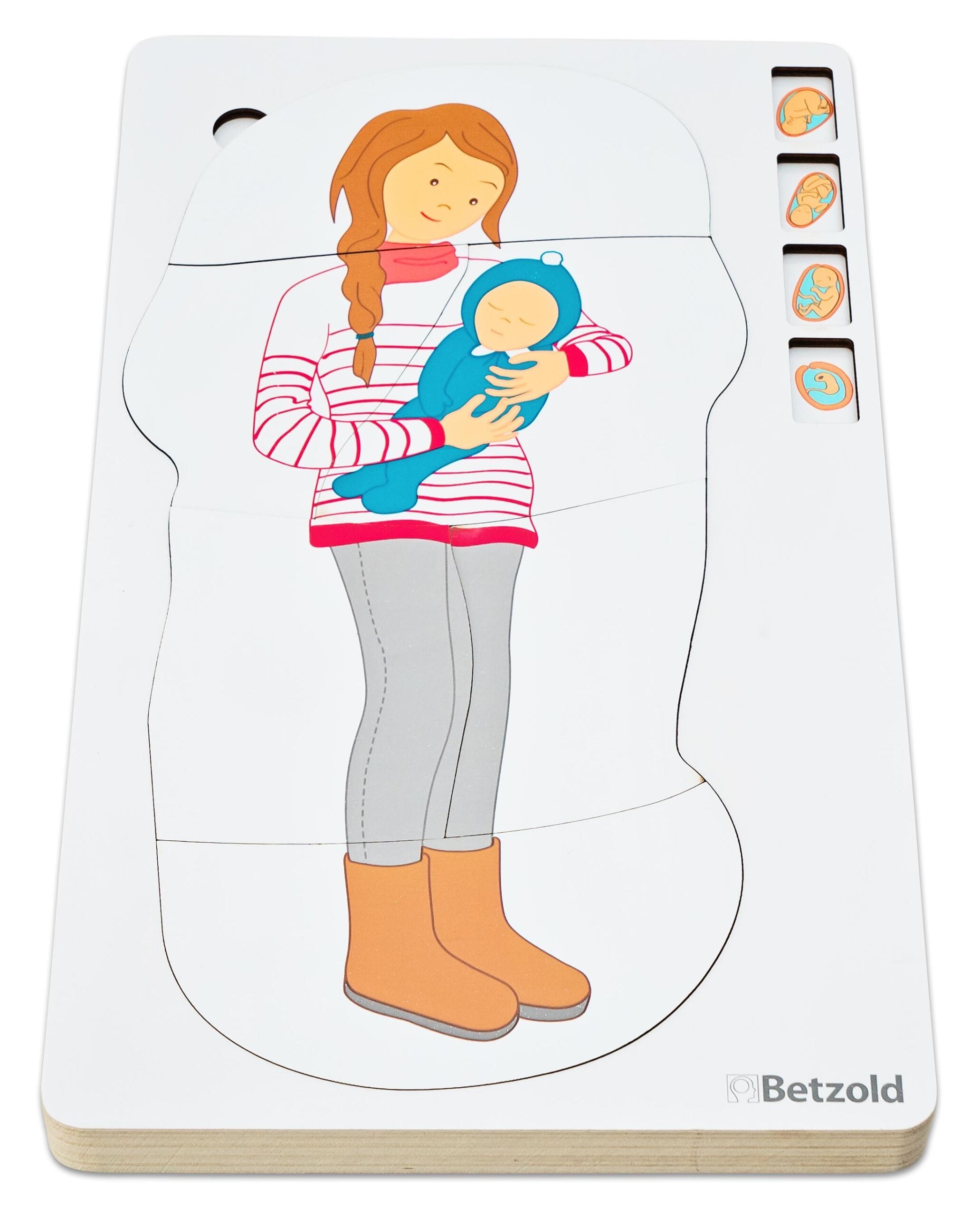 Puzzle integral din lemn, straturi multiple, fiecare cu o variaţie a temei: Mamă / Sarcină / Naştere. Imaginile, clar desenate pentru a facilita înţelegerea şi conversaţia cu copii, reprezintă mai multe stadii ale fătului, de la primele săptămâni de sarcină până aproape de momentul naşterii.