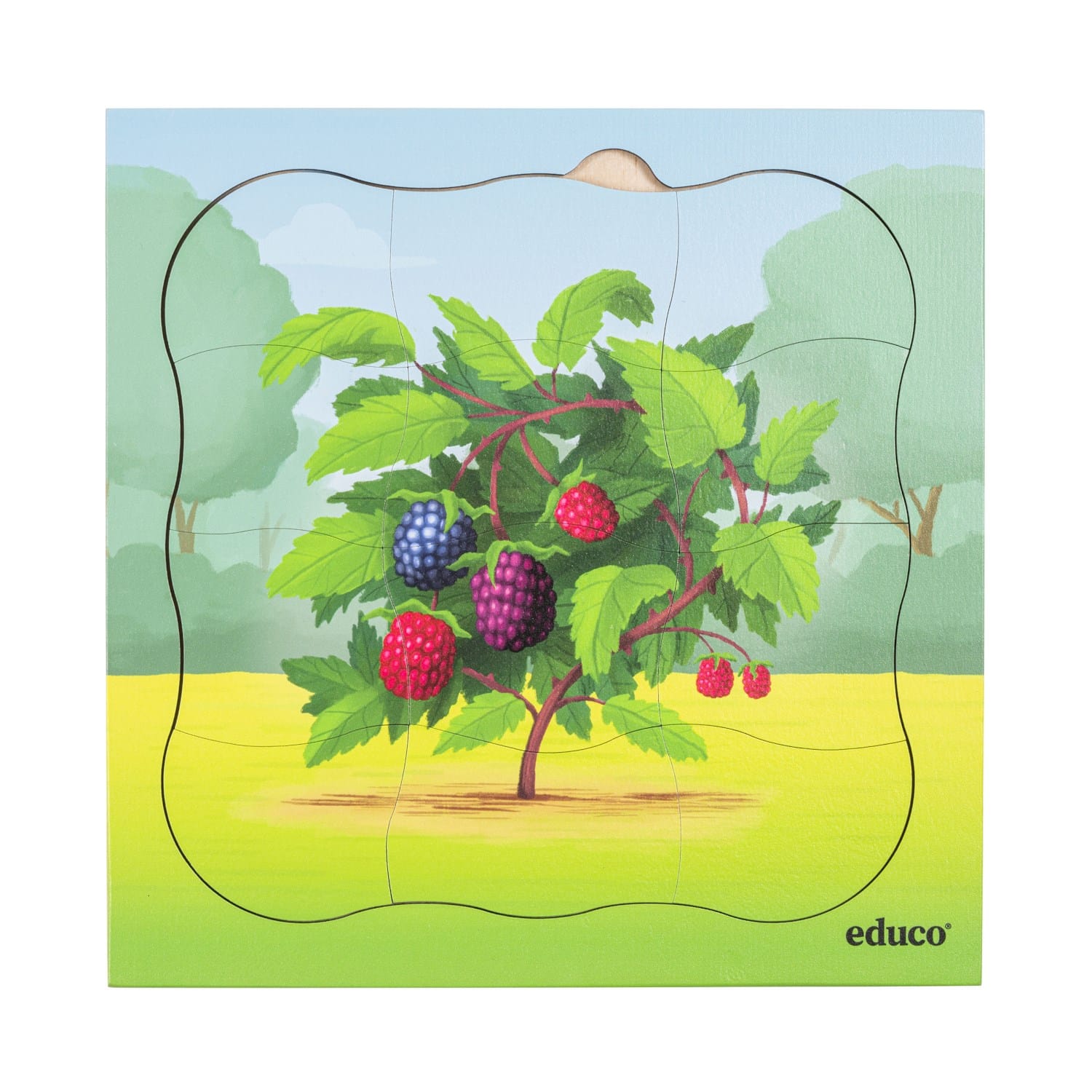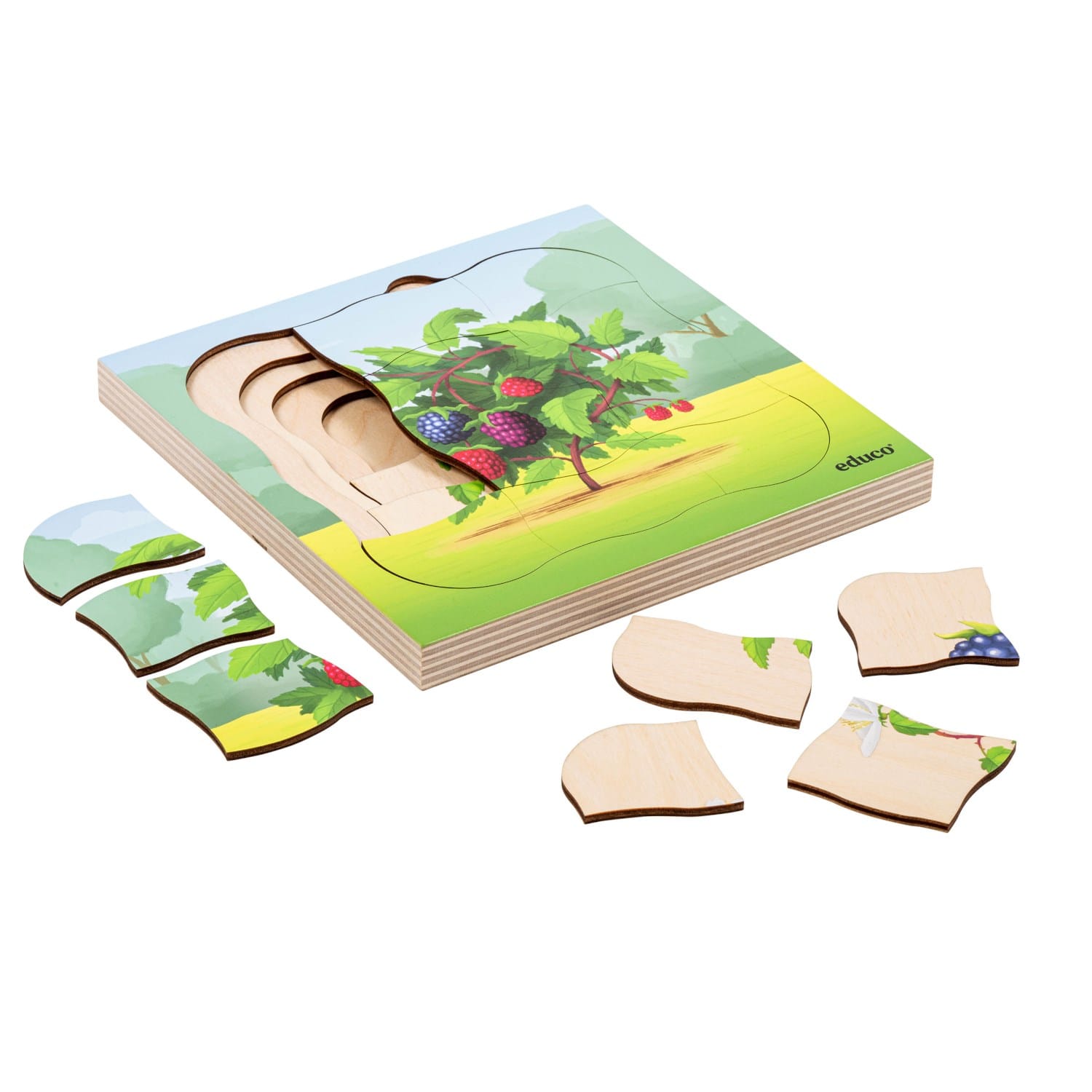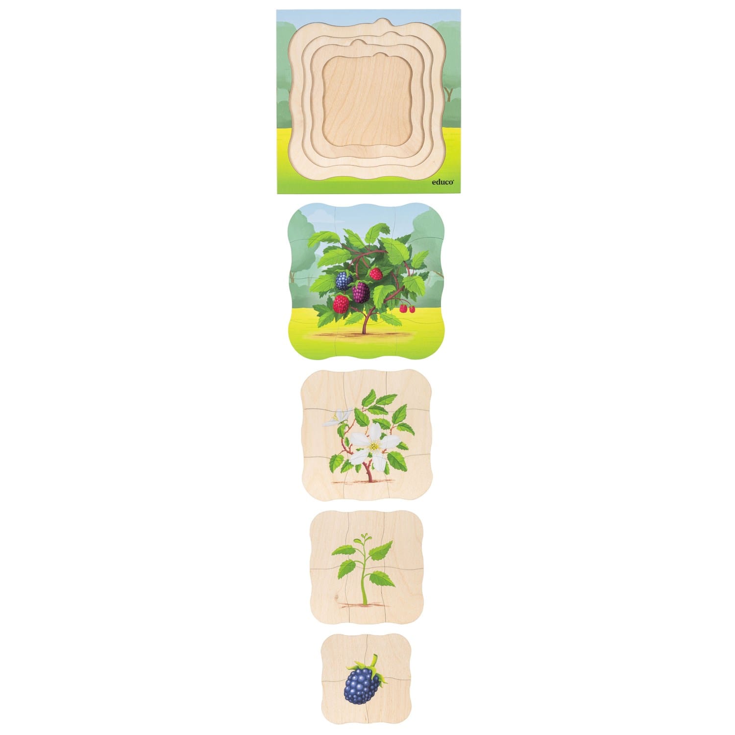 Acest puzzle cu 31 de piese în 4 straturi arată ciclul vieții unui fruct de pădure.