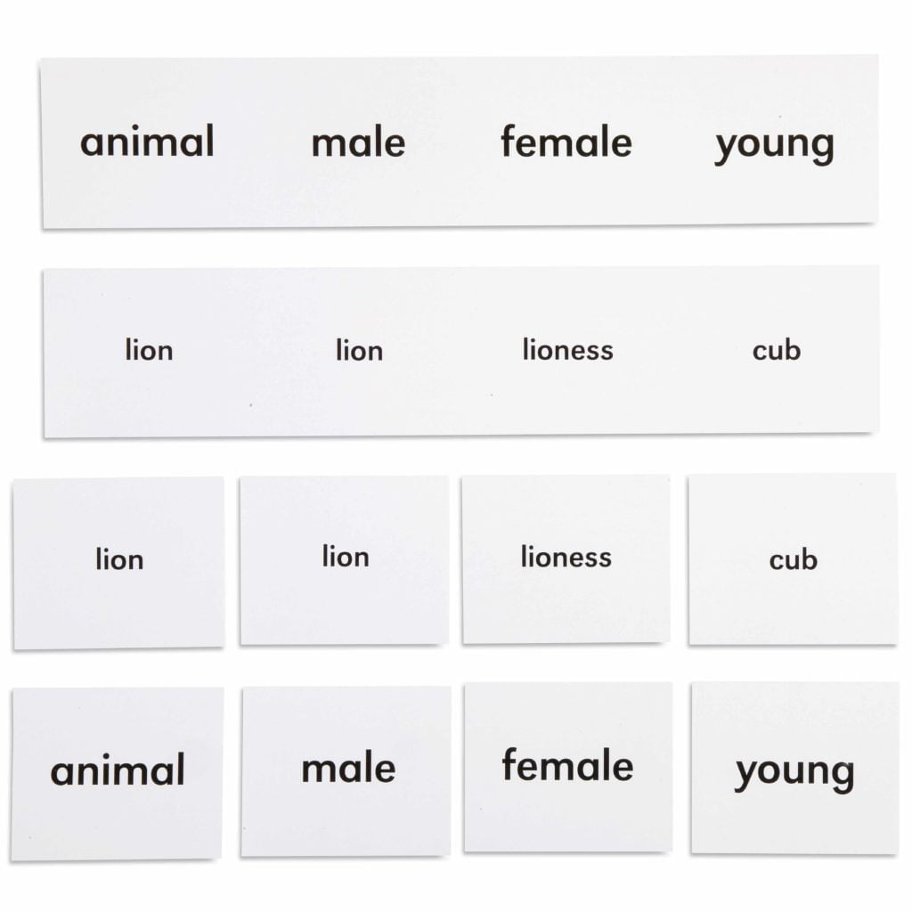 27 different wild and domestic animal names printed on white card stock. 112 cards naming the male, female and young and 27 control cards. Title cards included.
