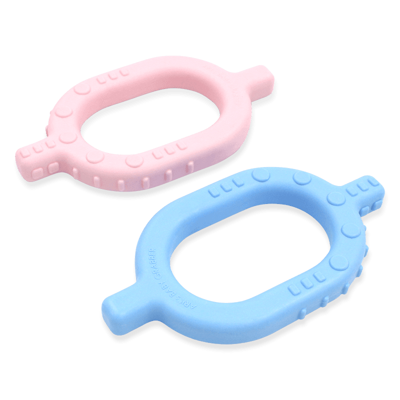 ARK Baby Grabber® este un instrument de masticație și explorare orală pentru bebeluși și toddleri, recomandat de la vârsta de 5 luni, conceput pentru logopedie și terapia de intervenție timpurie. Forma sa ovală cu două capete este netedă pe o jumătate și texturată cu proeminențe pe cealaltă, oferind două tipuri distincte de stimulare senzorială pe același instrument — moale și blând pentru desensibilizare, sau mai intens prin zona texturată. Disponibil în 2 niveluri de fermitate — Moale (Albastru deschis/Roz deschis/Galben deschis) și Ferm (Turcoaz) — pentru a se adapta nevoilor individuale ale fiecărui bebeluș. Fabricat în SUA din materiale de grad medical, fără BPA, fără ftalați, fără PVC și fără latex.