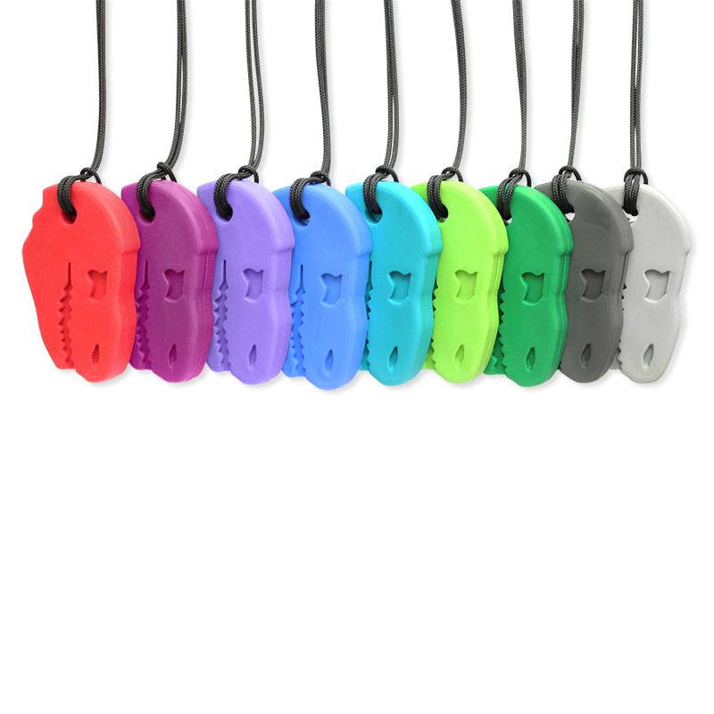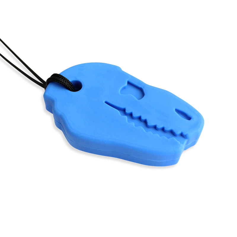 Designul de dinozaur, atractiv și recognoscibil, face ca purtarea unui instrument terapeutic să fie acceptabilă și chiar dorită de copii, transformând o nevoie senzorială într-un accesoriu cool. Pandantivul generos (cca. 3.8 × 6.4 cm x 1.3 cm grosime) este ideal pentru masticația cu incisivii și premolarii. Disponibil în diferite culori pe 3 niveluri de rezistență codificate cromatic – livrat cu șnur de siguranță breakaway. Fabricat în SUA din materiale de grad medical, fără BPA, fără ftalați, fără PVC și fără latex.