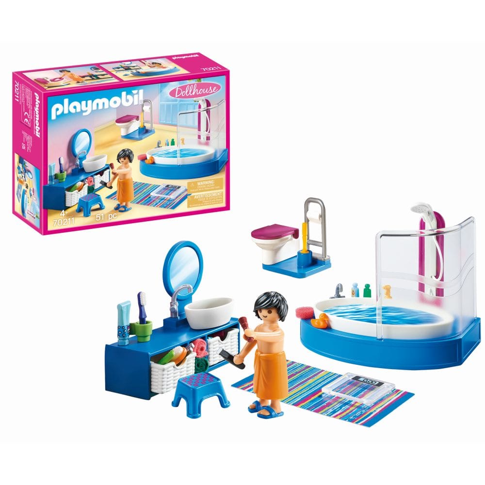 Baia familiei de la PLAYMOBIL este o adevarata oaza de relaxare. Cada cea mare este perfecta pentru a te spala, dar si pentru a te balaci in voie. Pentru a putea ajunge la chiuveta, exista un mic scaunel pe care copiii se pot urca, iar ca sa poata sa foloseasca toaleta, au un colac special pe care se pot aseza. Spatiile de depozitare de sub chiuveta sunt perfecte pentru a depozita prosopele sau alte articole de baie. Baia familiei este complet echipata si se poate combina cu Setul Casa mare de papusi (70205).