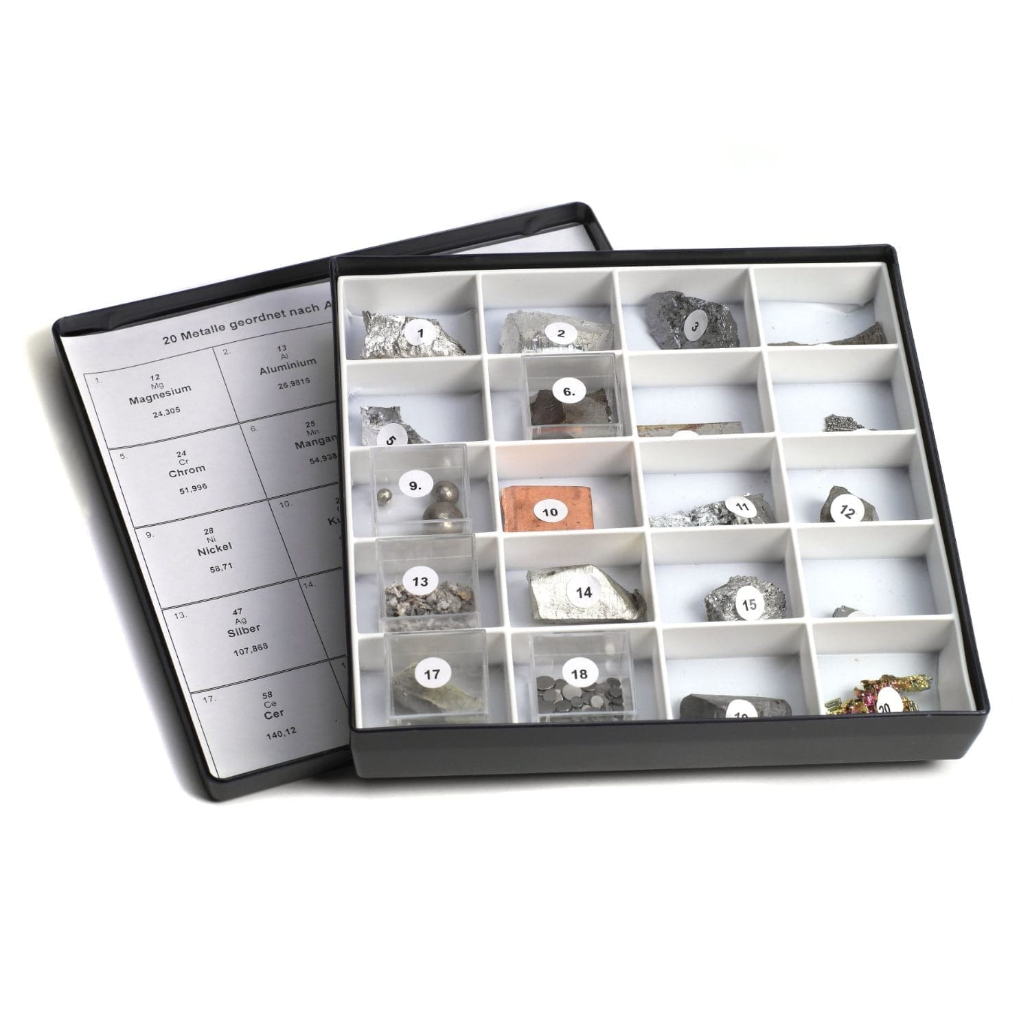 Set educativ cu 20 de metale tipice utilizate în procese industriale. Setul conţine 20 mostre cu cele mai cunoscute metale.