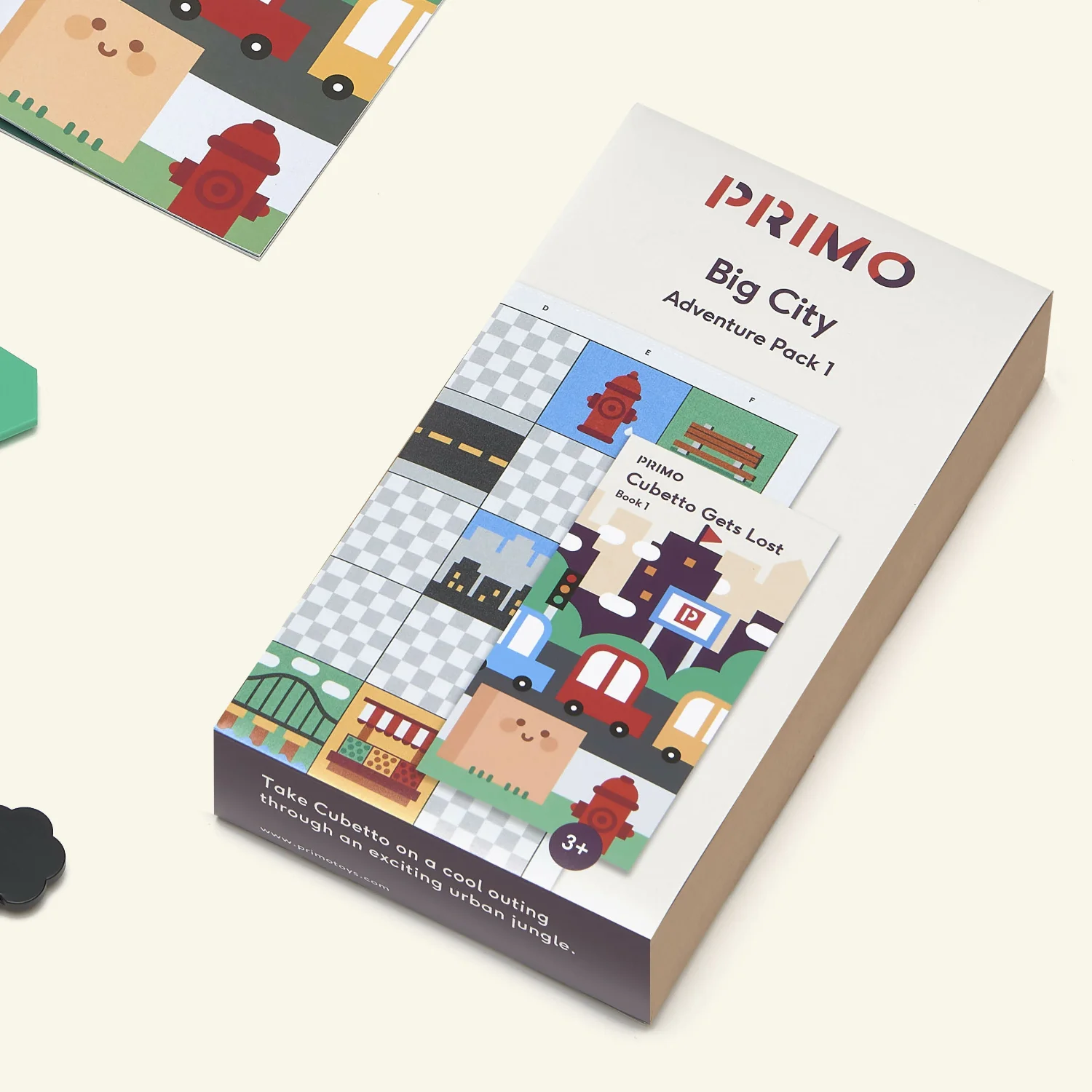 Set tip extensie pentru activități tematice cu robotul Cubetto. Conține 1 covor de joc cu tematica Aventuri în oraș.